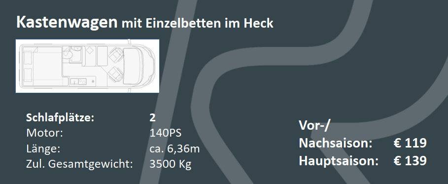 Ausstattung der Wohnmobile: Markise, Fahrradträger, Motorklimaanlage, Aufbauklimaanlage, Tempomat, Stromadapterkabel, 10m Verlängerungskabel, Ausgleichskeile, Italienschild, WC-Chemie, 2 Stk. Warnwesten, Verbandskasten