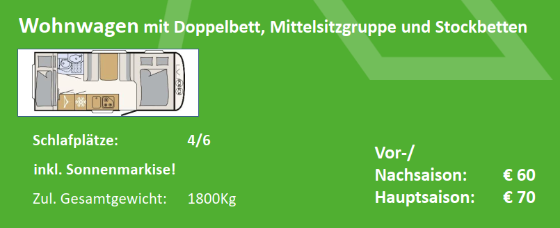 Ausstattung der Wohnwagen: Markise nach Möglichkeit - ansonsten Vorzelt, Fahrradträger, Adapter und Stromkabel, WC-Chemie, Ausgleichskeile, Aufbauklimaanlage